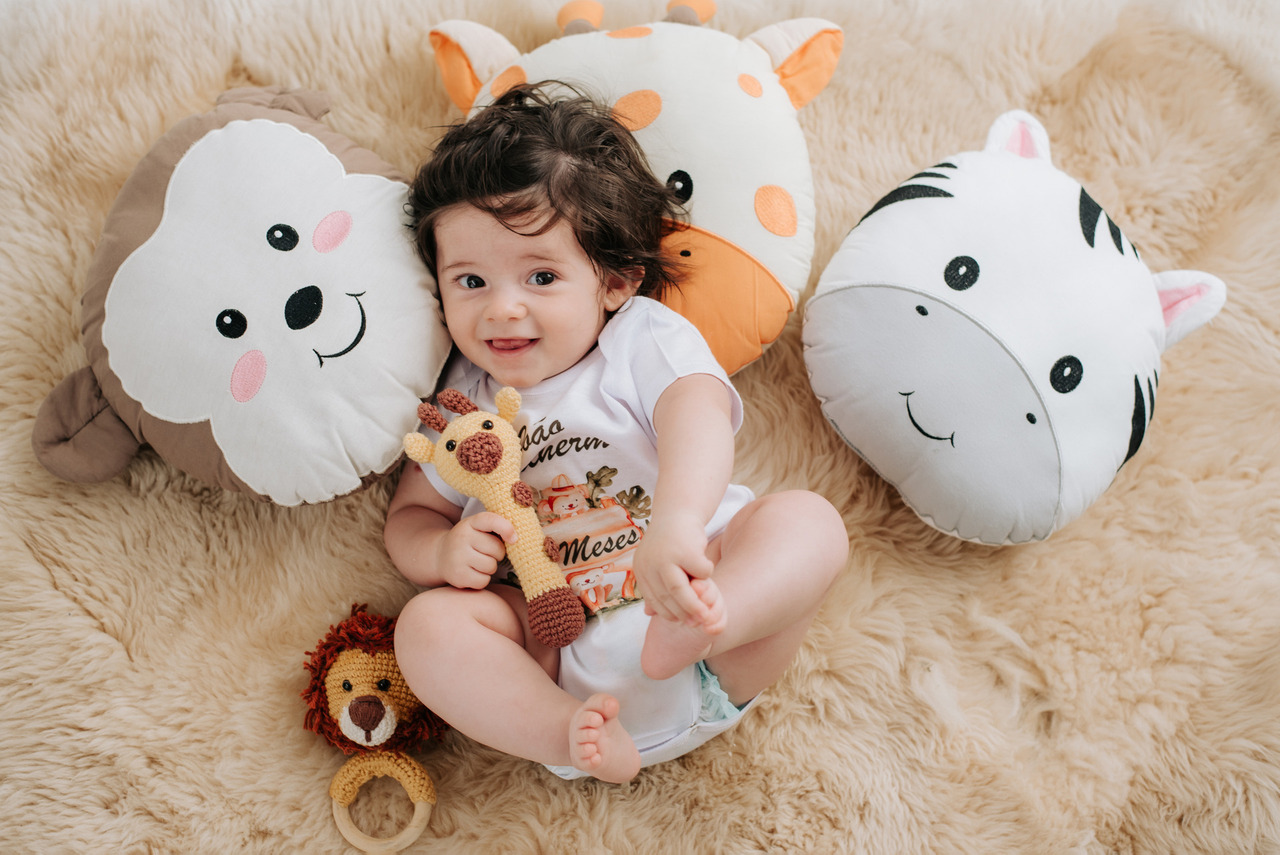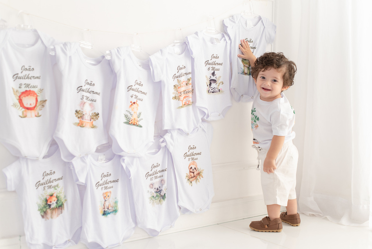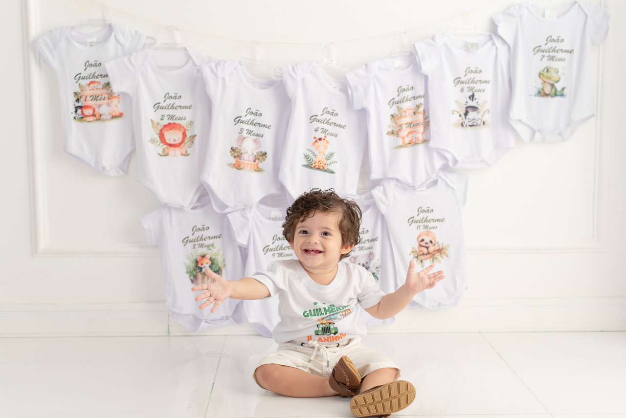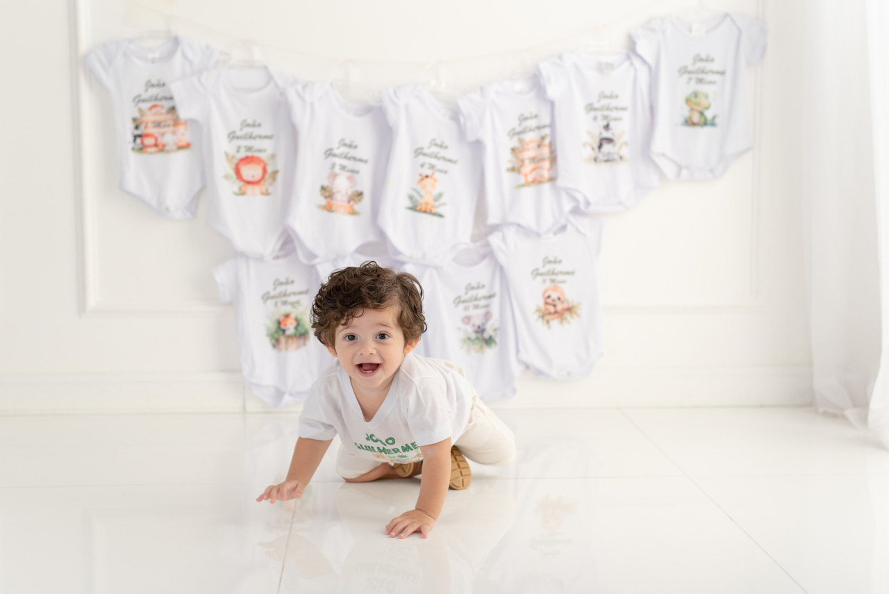 Registramos toda sua evolução mês a mês com seus brinquedinhos e conseguimos capturar todas as novas interações e aprendizados ao longo de 1 ano. Veja como o tempo passa rápido...